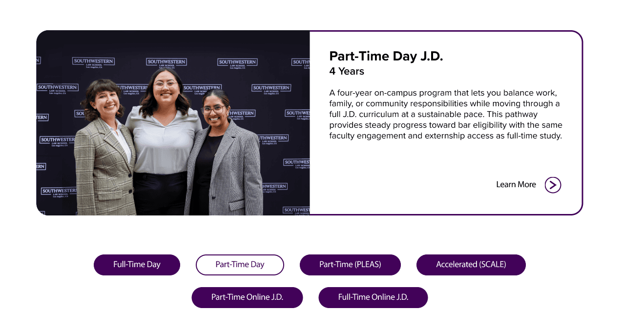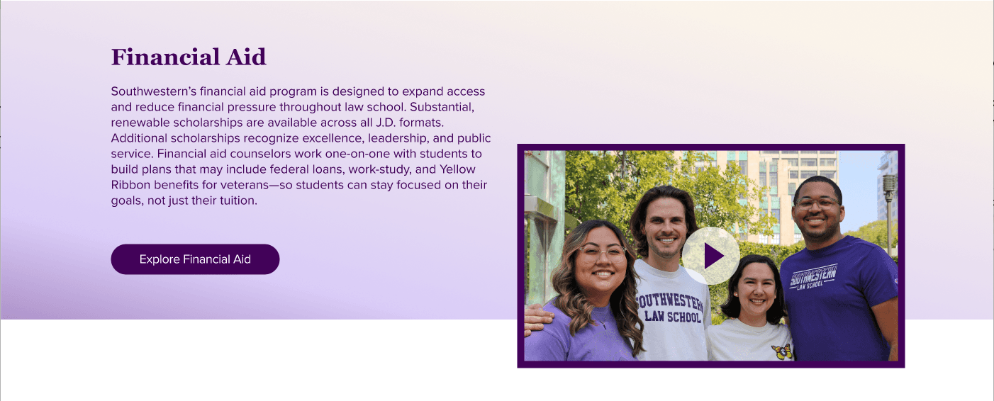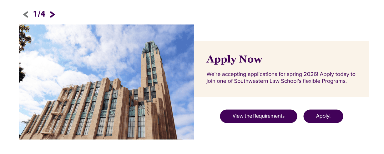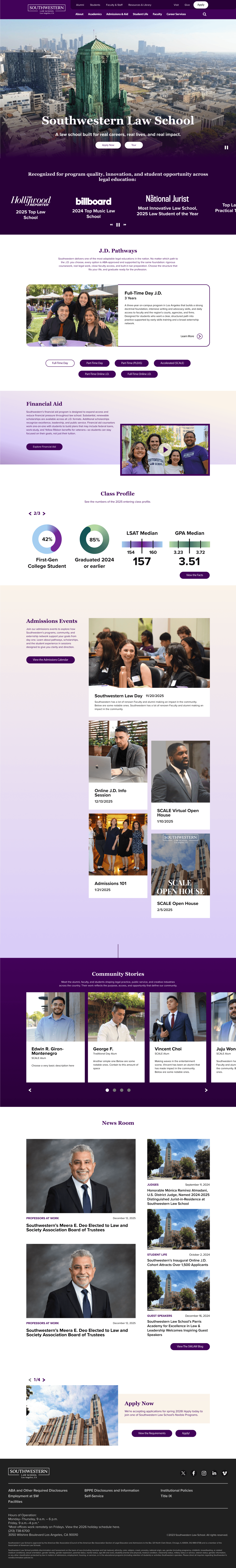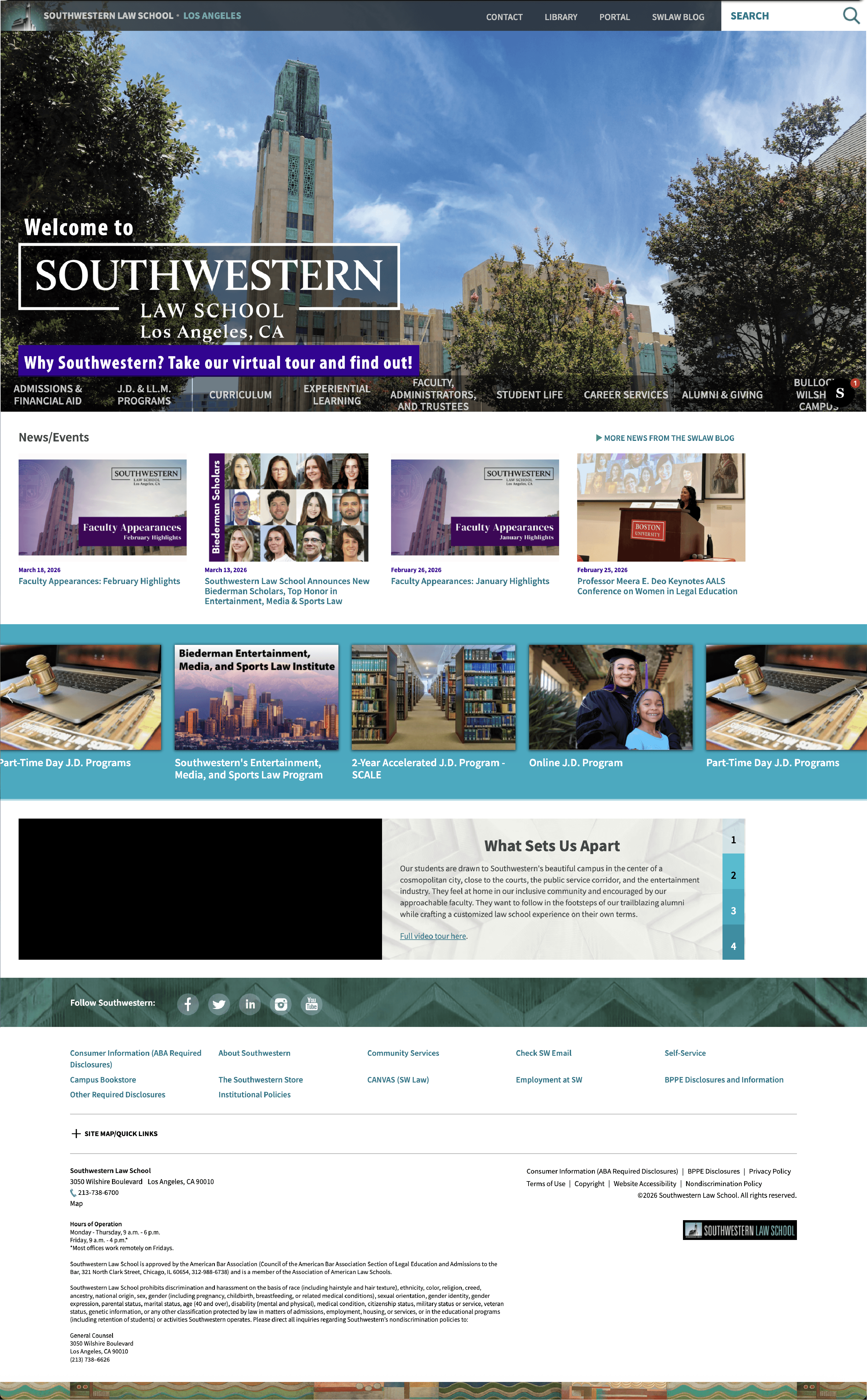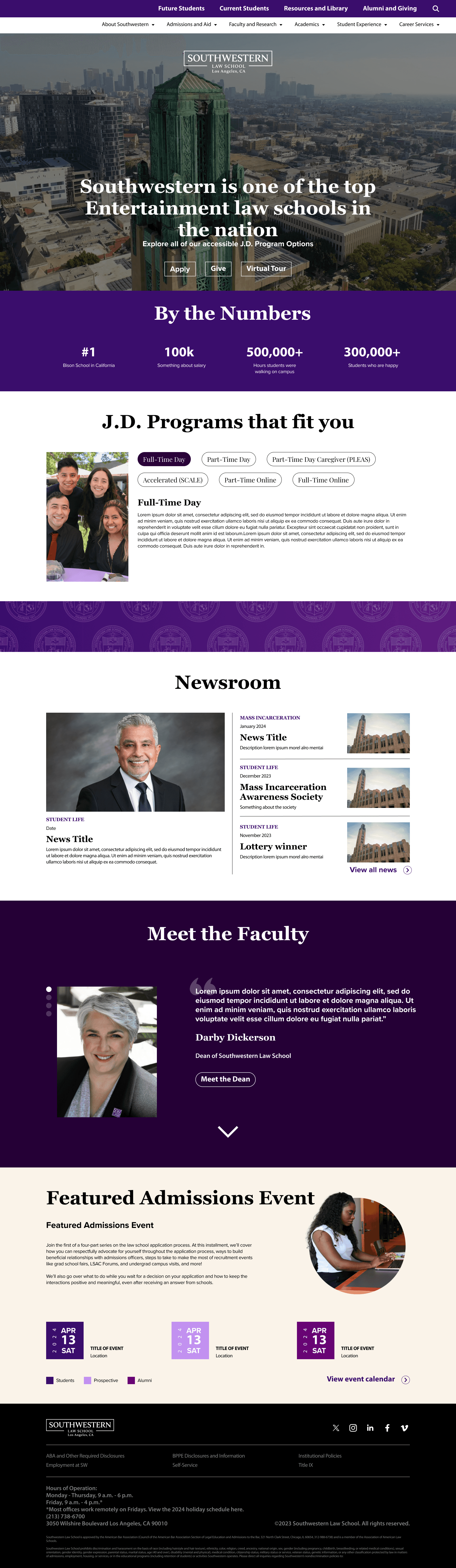 Design SWLAW’s homepage as a guided entry point for prospective students, surfacing the most common questions and routing users toward our goal (Request Info, Visit, Apply). The navigation was condensed and restructured to reduce dropdown overload help users find what they need if it wasn't included on the mainpage.